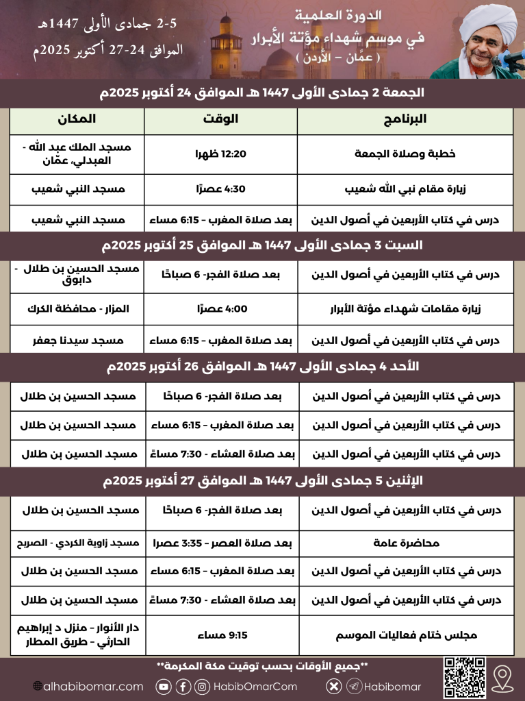 يقام بمشيئة الله تعالى موسم شهداء مؤتة الأبرار في المملكة الأردنية الهاشمية من 2 إلى 5 جمادى الأولى 1447هـ الموافق 24 إلى 27 أكتوبر 2025م