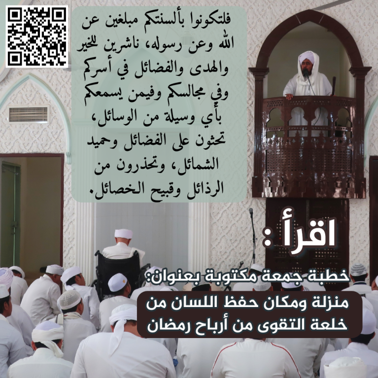 - فلتكونوا بألسنتكم مبلغين عن الله وعن رسوله، ناشرين للخير والهدى والفضائل في أسركم وفي مجالسكم وفيمن يسمعكم بأي وسيلة من الوسائل، تحثون على الفضائل وحميد الشمائل، وتحذرون من الرذائل وقبيح الخصائل.