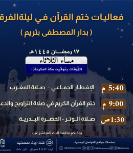 بفضل الله تعالى، تم في ليلة الأربعاء ١٧ رمضان ١٤٤٥هـ، ختم القرآن الكريم في صلاة التراويح في دار...