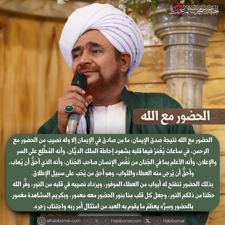 الحضور مع الله نتيجة صدق الإيمان، ما مِن صادق في الإيمان إلا وله نصيب من الحضور مع الرحمن، في ساعات يُغْمَرُ فيها قلبه بشهود إحاطة الملك الديَّان، وأنه المُطَّلِع على السر والإعلان، وأنه الأعلم بما في الجَنان من نَفْس الإنسان صاحب الجَنَان، وأنه الذي أحقُّ أن يُهاب، وأحقُّ أن يُرجى منه العطاء والثواب، وهو أحق من يُحَب على سبيل الإطلاق.
