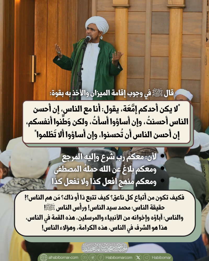 قال ﷺ في وجوب إقامة الميزان والأخذ به بقوة: "لا يكن أحدكم إمَّعَة، يقول: أنا مع الناس، إن أحسن الناس أحسنتُ، وإن أساؤوا أسأتُ، ولكن وَطِّنوا أنفسكم، إن أحسن الناس أن تُحسنوا، وإن أساؤوا ألا تَظلموا"