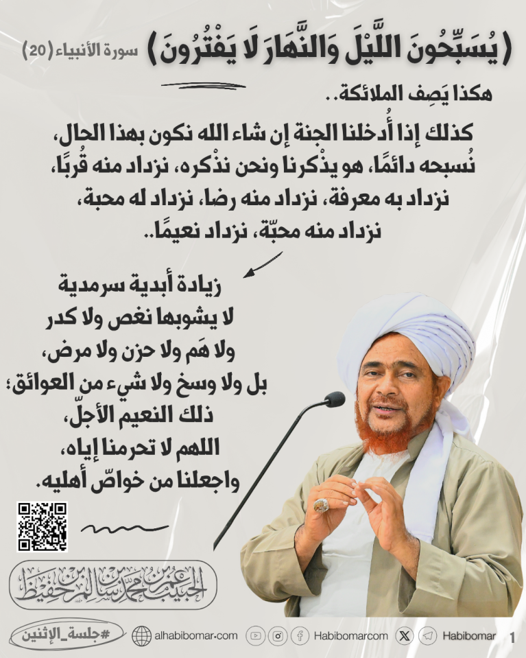 - كذلك إذا أُدخلنا الجنة إن شاء الله نكون بهذا الحال، نُسبحه دائمًا، هو يذْكرنا ونحن نذْكره، نزداد منه قُربًا، نزداد به معرفة، نزداد منه رضا، نزداد له محبة، نزداد منه محبّة، نزداد نعيمًا، زيادة أبدية سرمدية لا يشوبها نغص ولا كدر ولا هَم ولا حزن ولا مرض، بل ولا وسخ ولا شيء من العوائق؛ ذلك النعيم الأجلّ، اللهم لا تحرمنا إياه، واجعلنا من خواصّ أهليه.