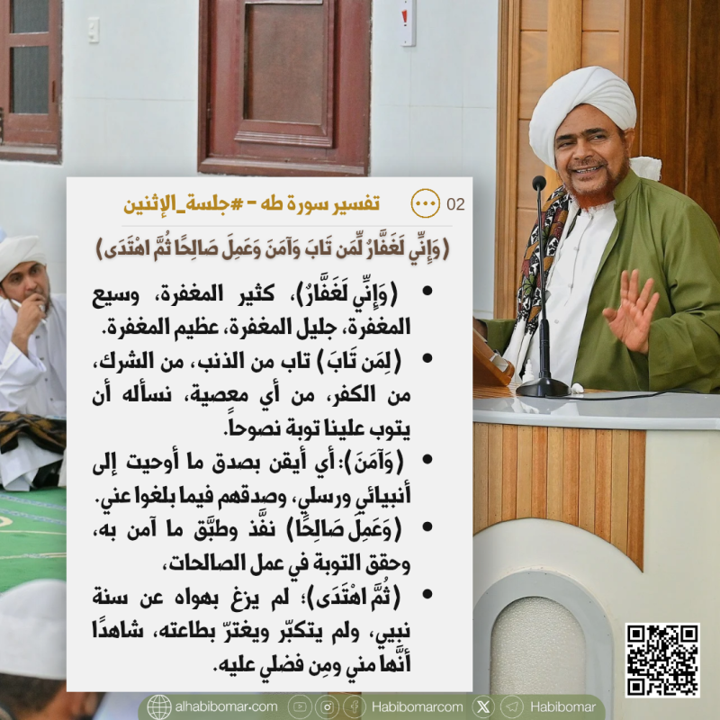 (وَإِنِّي لَغَفَّارٌ لِّمَن تَابَ وَآمَنَ وَعَمِلَ صَالِحًا ثُمَّ اهْتَدَىٰ (82)):