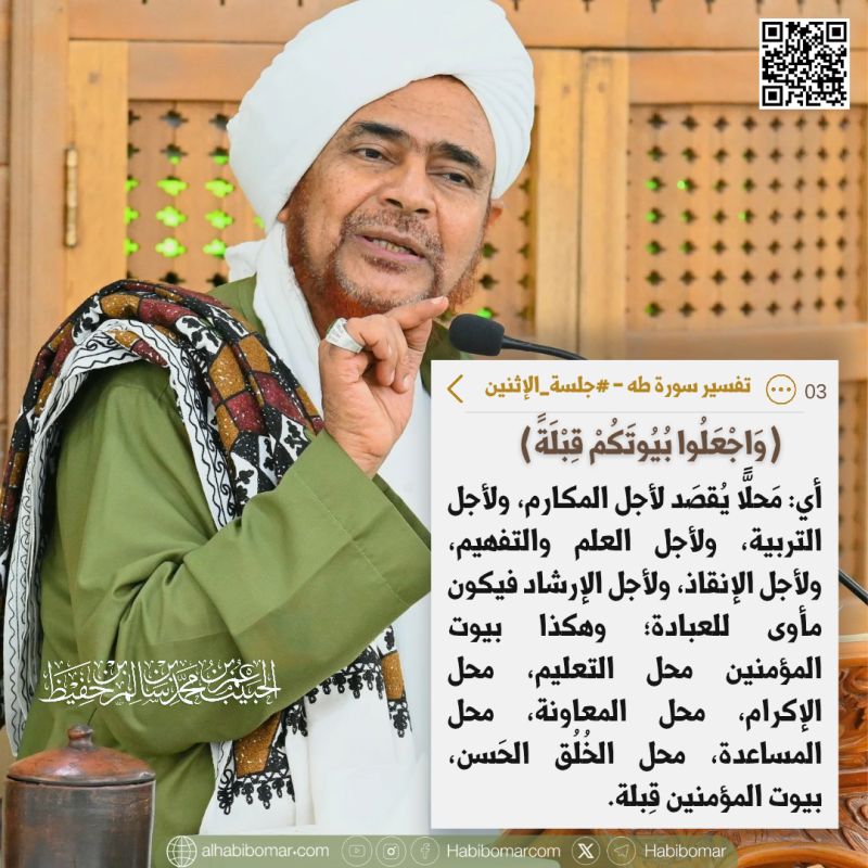(وَاجْعَلُوا بُيُوتَكُمْ قِبْلَةً)؛ أي: مَحلًّا يُؤمّ ويُقصَد لأجل المكارم، ولأجل التربية، ولأجل العلم والتفهيم، ولأجل الإنقاذ، ولأجل الإرشاد فيكون مأوى للعبادة؛ وهكذا بيوت المؤمنين محل التعليم، محل الإكرام، محل المعاونة، محل المساعدة، محل الخُلُق الحَسن، بيوت المؤمنين قِبلة.