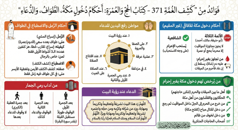 فوائد من "كشف الغمة 371- كتاب الحج والعمرة: دخول المحرم مكة والطواف"