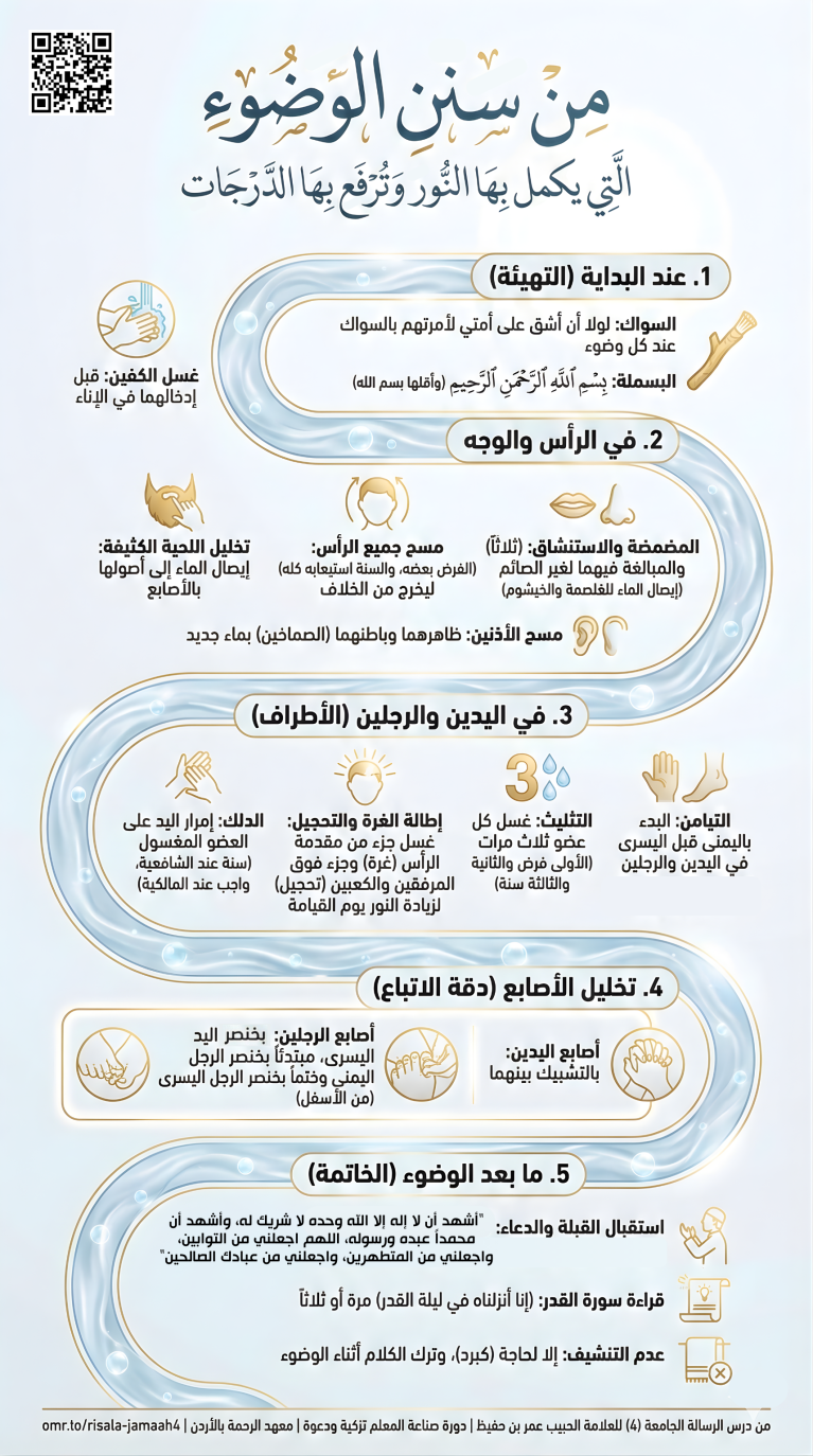 الوضوء عبادة وقربة، وليس مجرد نظافة ظاهرة. وللوضوء سننٌ وآدابٌ تزيد في نور المؤمن يوم القيامة، كما بينها الحبيب عمر بن حفيظ في شرحه لكتاب "الرسالة الجامعة". إليكم التسلسل العملي لهذه السنن:
