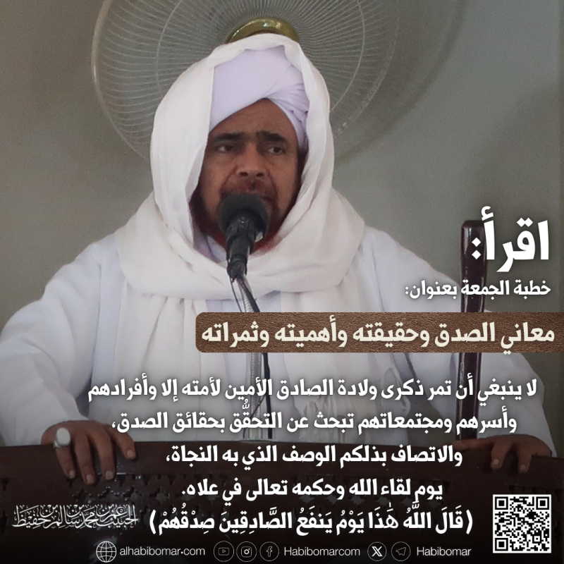 ولا ينبغي أن تمر ذكرى ولادة الصادق الأمين لأمته إلا وأفرادهم وجماعاتهم وأسرهم ومجتمعاتهم تبحث عن التحقُّق بحقائق الصدق، والاتصاف بذلكم الوصف الذي به النجاة، يوم لقاء الله وحكمه تعالى في علاه.