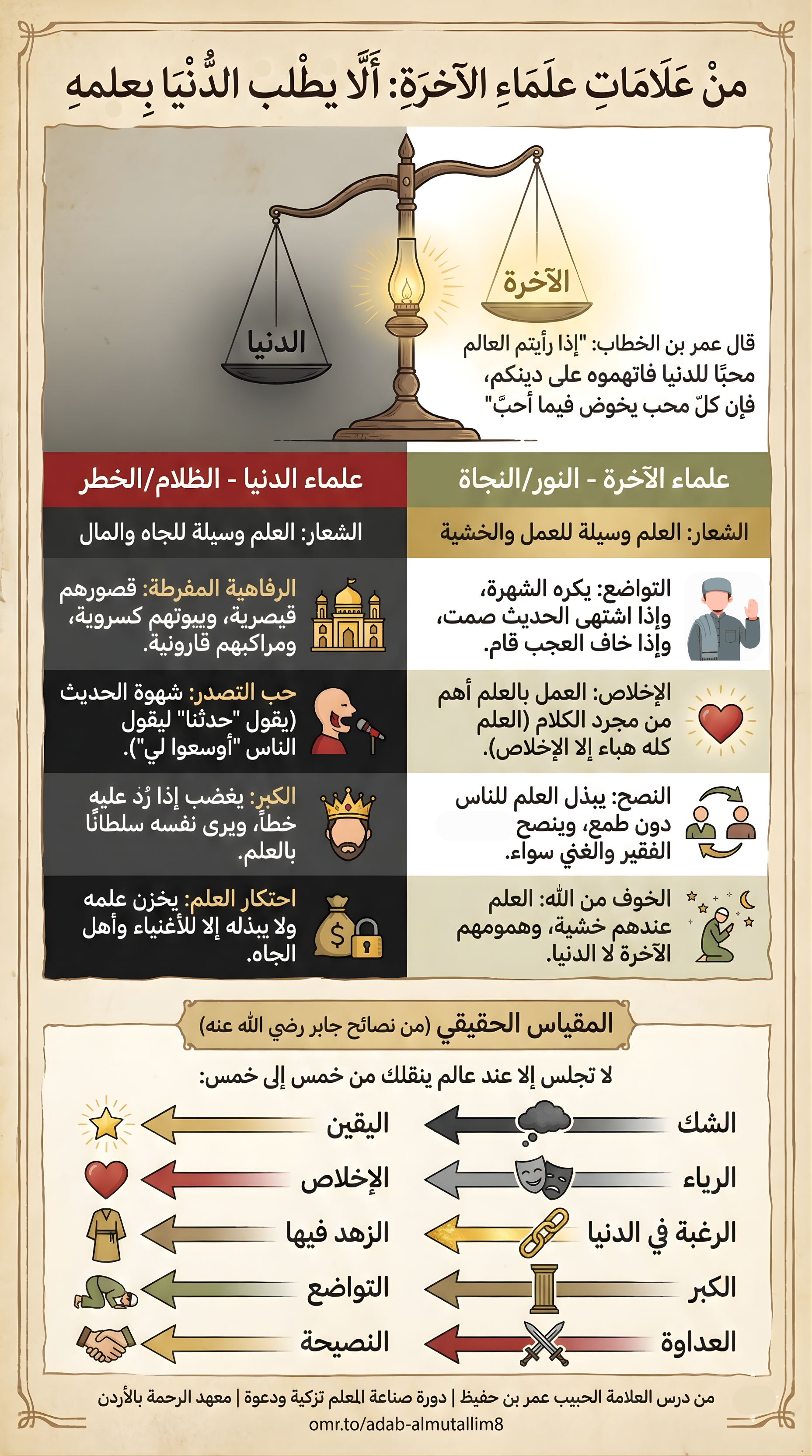 ورويَ عنْ جابرٍ -رضيَ اللهُ عنهُ- موقوفا ومرفوعاً إلى رسولِ اللهِ ﷺ أنَّهُ قالَ: "لا تجلسوا عندَ كلِّ عالمٍ إلا عالمٍ يدعوكُمْ مِنْ خمسٍ إلىٰ خمسٍ: مِنَ الشّكَّ إلى اليقينِ، ومِنَ الرياءِ إلى الإخلاصِ، ومِنَ الرغبةِ إلى الزهدِ، ومِنَ الكِبْرِ إلى التواضعِ، ومِنَ العداوةِ إلى النصيحةِ".