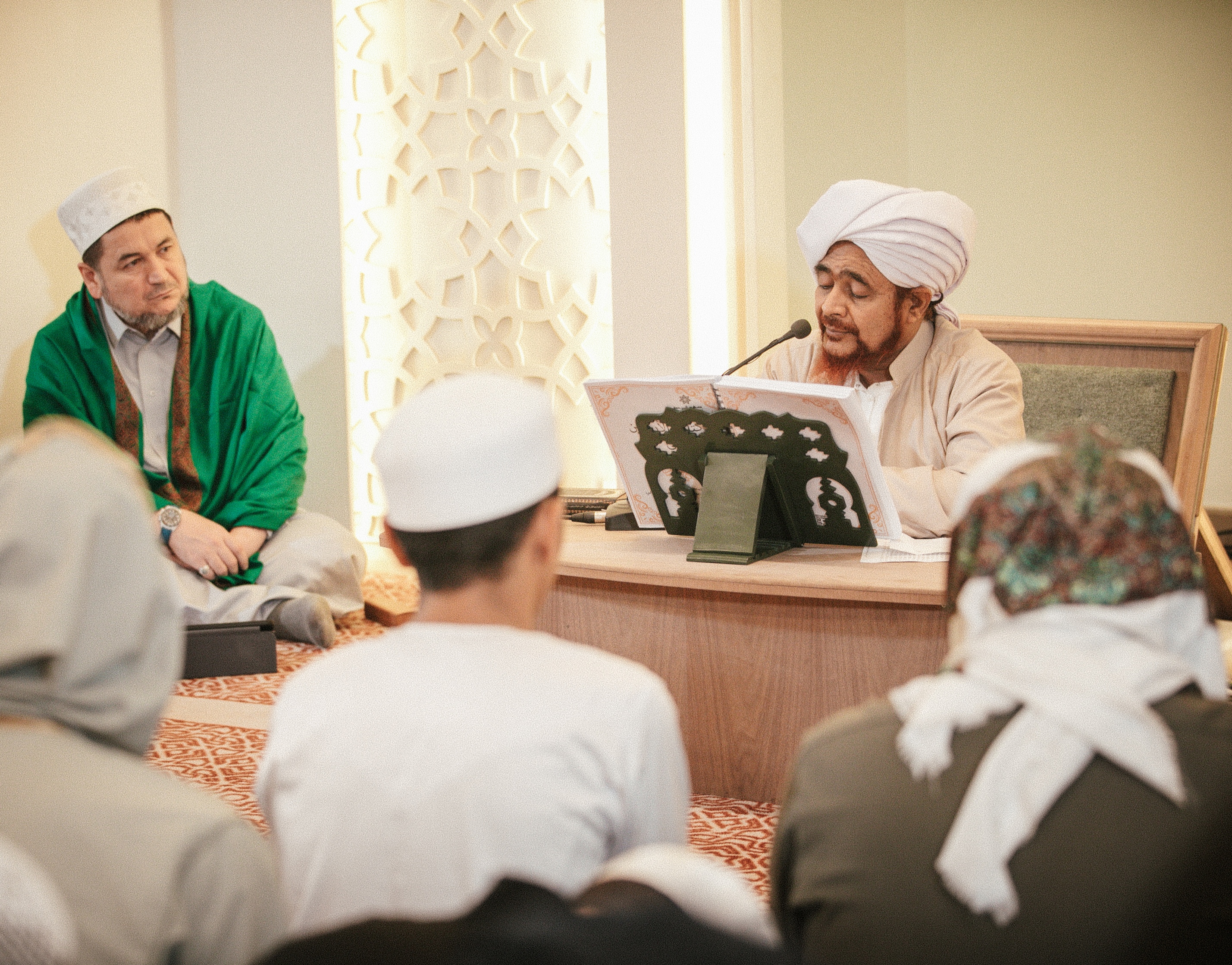 فيكون لك نصيب من التلاوة في الصلاة -كما سيأتي- ونصيب من التلاوة وأنت مستقبل القبلة، وجالس إما على هيئة التشهد، إما متورِّكاً وإما مفترشاً، وهذا أفضل من التربع، والعمل أيضًا على التربّع عند كثير من أهل العلم والصلاح لم يروا في ذلك بأساً، وإنما كثير منهم رأوا أنه غير لائق بالأدب، فكانوا عند تلاوة القرآن وبين يدي المشايخ ما يتربّعون؛ ولكن كثير من أرباب العلم والصلاح اختاروا أن يكون التربّع من جملة الهيئات التي يُقرأ بها القرآن، والتي أيضاً يُجلس عليها بين يدي الشيوخ.