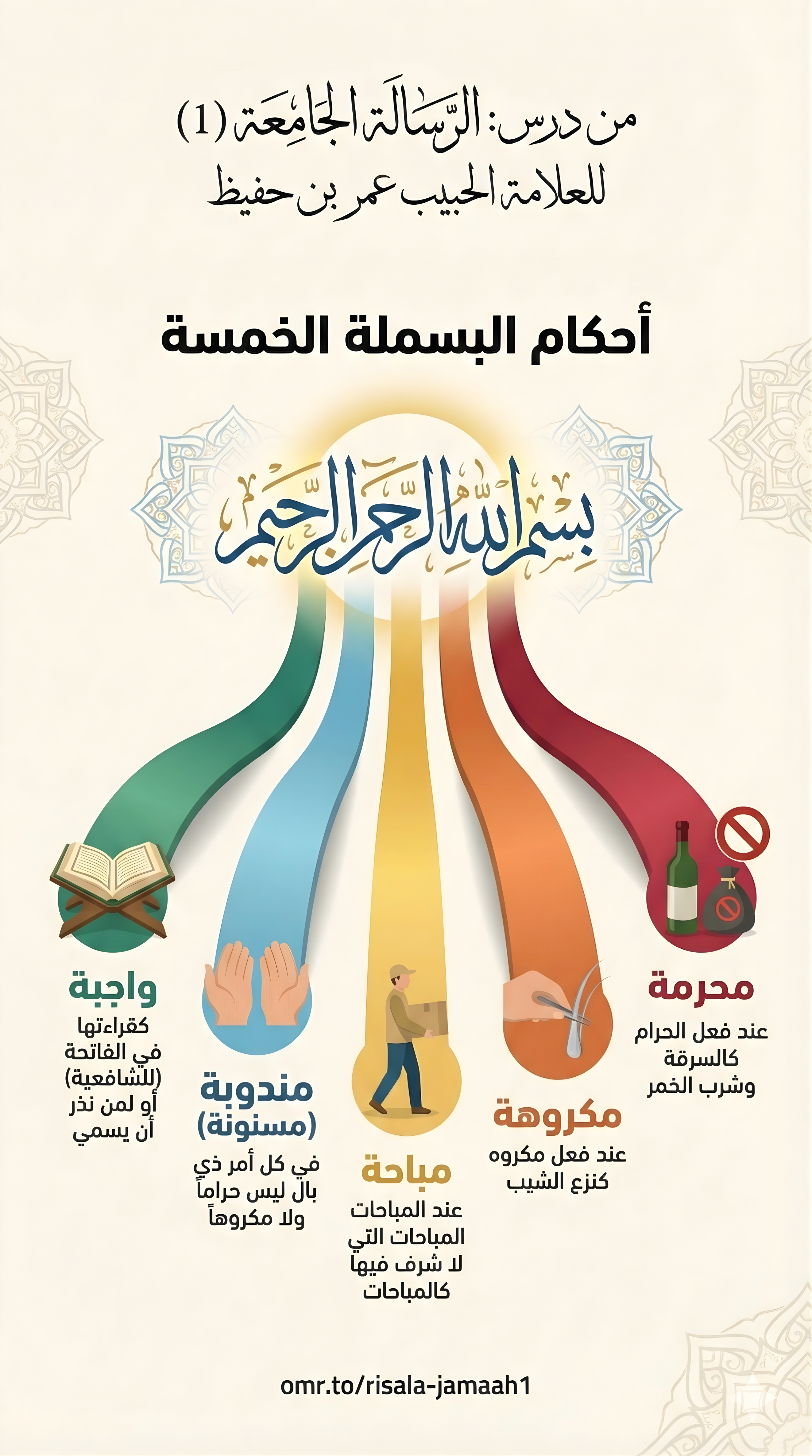 وبهذا عرفنا ما يتعلق أيضًا بحكم البسملة، فهم يذكرون عندما يقرؤون في كتب الفقه الأحكام التي تعتري البسملة، والأحكام في شرع الله -سبحانه وتعالى- خمسة أحكام يتفرّع عنها سادسٌ وسابع.