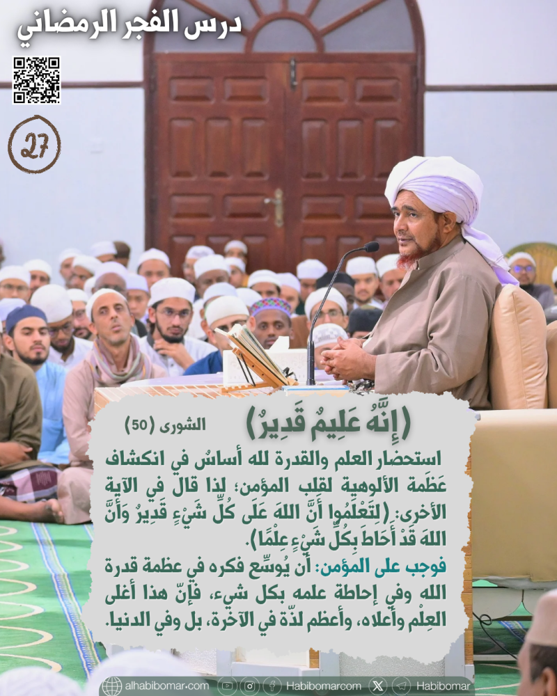 (إِنَّهُ عَلِيمٌ قَدِيرٌ (50)) -جل جلاله وتعالى في علاه- فها هو يتعرّف إلينا باستئثاره الخلق والإيجاد وتَصرّفه في الوجود؛ لندخل ميادين المعرفة؛ والمعرفة العامة التي لا يحكم بالإيمان إلا بها، ولكن المعرفة الخاصة، قال الإمام الحداد: "وأول قَدَمٍ يضعها السائر إلى الله في طريق المعرفة الخاصة استواء السريرة والعلانية"، أن تستوي سريرته وعلانيّته..