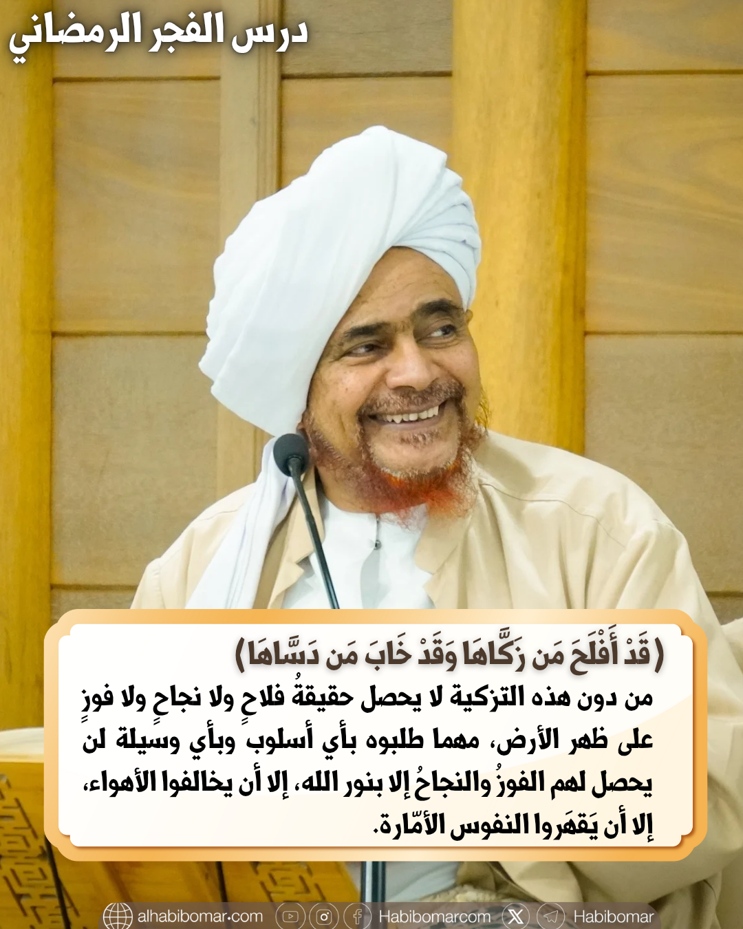 ومن دون هذه التزكية لا يحصل حقيقةُ فلاحٍ ولا نجاحٍ ولا فوزٍ للبشر على ظهر الأرض ولا للجن، مهما طلبوه بأي أسلوب وبأي وسيلة لن يحصل لهم الفوزُ والنجاحُ إلا بنور الله، إلا أن يخالفوا الأهواء، إلا أن يَقهَروا النفوس الأمّارة، وأما مِن دون ذلك فقَدْ (خَابَ مَن دَسَّاهَا) لهم الخيبة، ما يُحَصِّلون غير الخيبة بحضاراتهم وبأنظمتهم يعملون ما يعملون والنهاية خيبة، والنهاية هلاك وضُر، وكما ترون أشائر ذلك في كل الأدعياء على ظهر الأرض، والحق عند الحق ومِن الحق.
