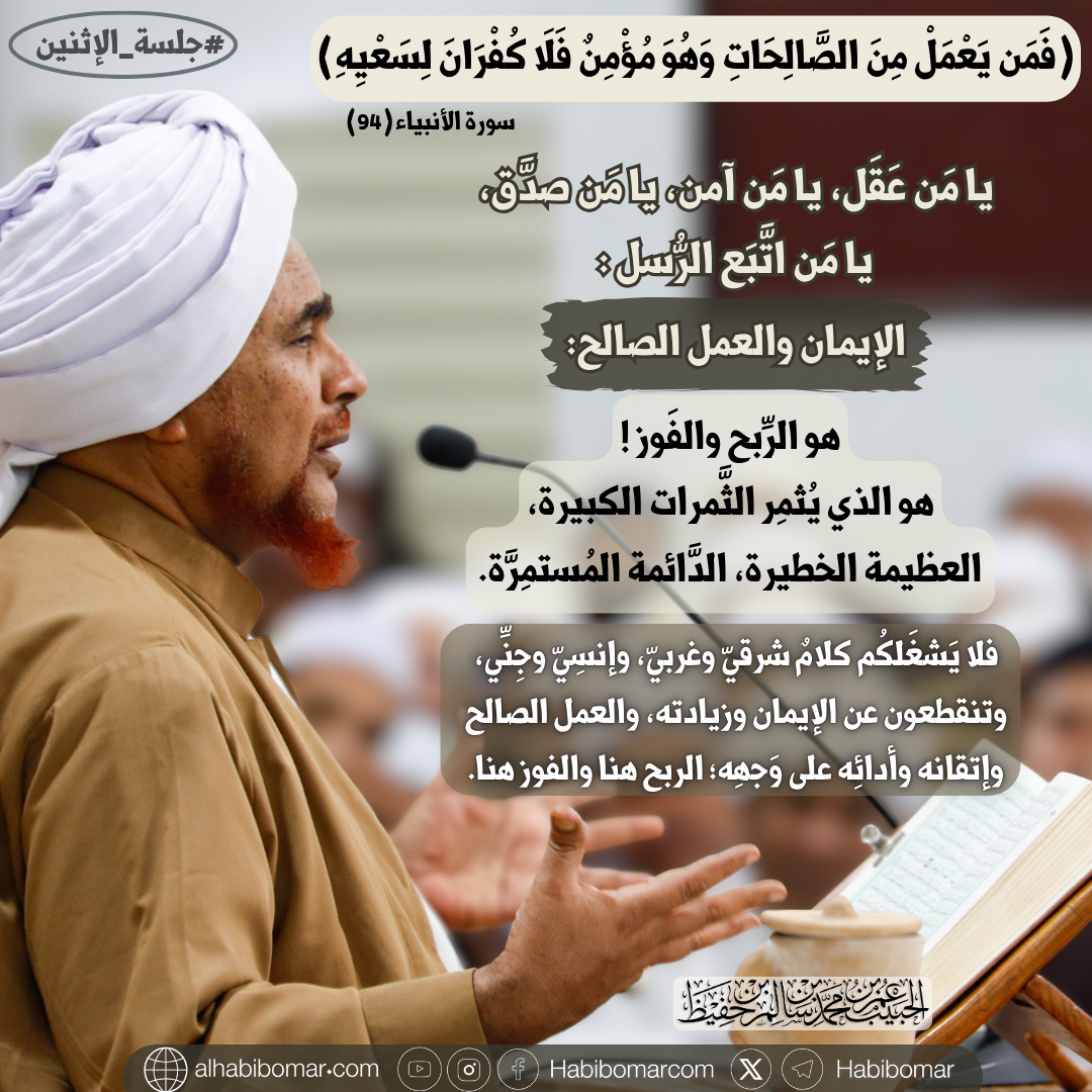 يا مَن عَقَل، يا مَن آمن، يا مَن صدَّق، يا مَن اتَّبَع الرُّسل؛ الإيمان والعمل الصالح: