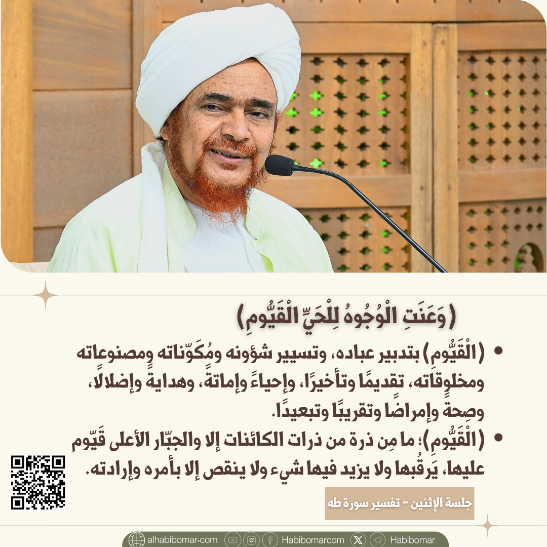 (وَعَنَتِ الْوُجُوهُ لِلْحَيِّ الْقَيُّومِ) وهو قيوم قائم بنفسه سبحانه وتعالى، غير مفتقر لمن عداه، وكل من عداه مُفتقر إليه، أبدي سرمدي، ليس له بداية ولا نهاية، لا افتتاح لوجوده ولا آخرية لبقائه سبحانه وتعالى.