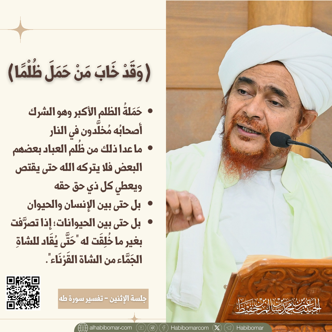 (وَقَدْ خَابَ مَنْ حَمَلَ ظُلْمًا) فيا خيبة الظالمين! مهما اغترُّوا، ومهما ظنوا أنهم أدركوا شيئًا وأنهم قهَروا العبادَ بشيء، فيا خيبتهم ويا ما أخطر مُستقبلَهم ومآلَهم! (وَقَدْ خَابَ مَنْ حَمَلَ ظُلْمًا).