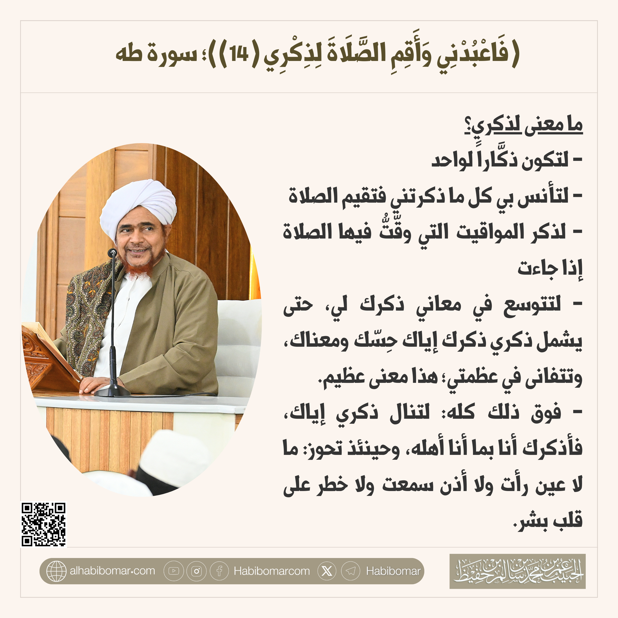 (وَأَقِمِ الصَّلَاةَ لِذِكْرِي) هنا كان يقول بعض العارفين: إن أنواع عبادتنا لله -تبارك وتعالى- ما بين أقوال وأفعال وأحوال: