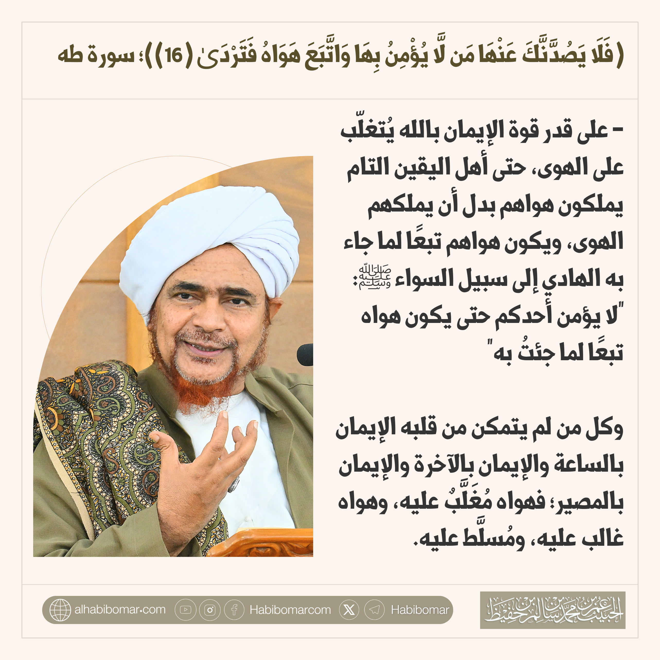 وعلى قدر قوة الإيمان بالله؛ يتغلّب على الهوى، حتى أهل اليقين التام يملكون هواهم بدل أن يملكهم الهوى، ويكون هواهم تبعًا لما جاء به الهادي إلى سبيل السواء، القائل في قوة الإيمان -أي كماله- : "لا يؤمن أحدكم حتى يكون هواه تبعًا لما جئتُ به". وكل من لم يتمكن من قلبه الإيمان بالساعة والإيمان بالآخرة والإيمان بالمصير؛