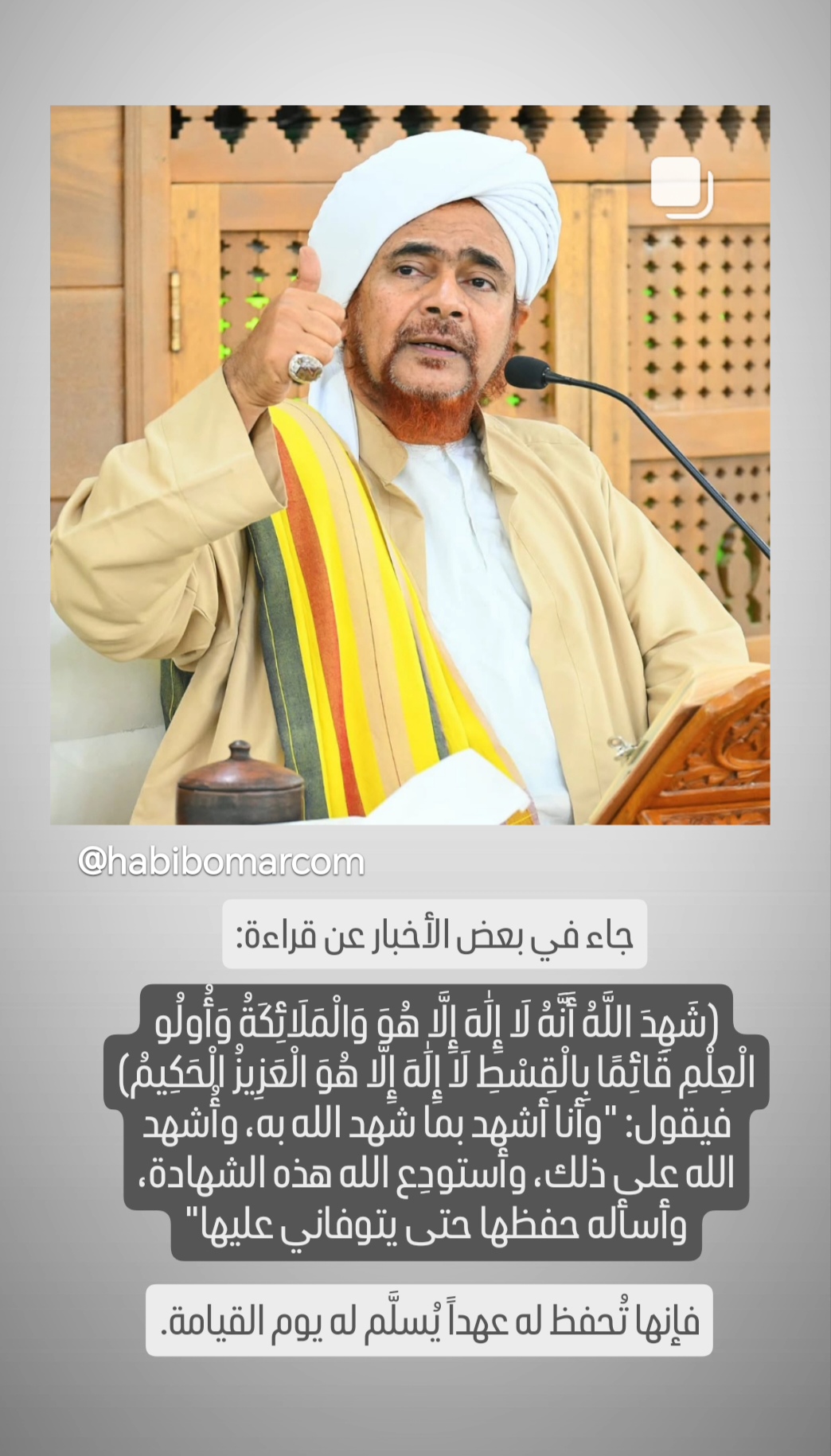 مِن ذلك ما جاء في بعض الأخبار: عن قراءة: (شَهِدَ اللَّهُ أَنَّهُ لَا إِلَٰهَ إِلَّا هُوَ وَالْمَلَائِكَةُ وَأُولُو الْعِلْمِ قَائِمًا بِالْقِسْطِ لَا إِلَٰهَ إِلَّا هُوَ الْعَزِيزُ الْحَكِيمُ) [آل عمران:18]، فيقول: "وأنا أشهد بما شهد الله به، وأُشهد الله على ذلك، وأستودِع الله هذه الشهادة، وأسأله حفظها حتى يتوفاني عليها"، فإنها تُحفظ له عهداً يُسلَّم له يوم القيامة.