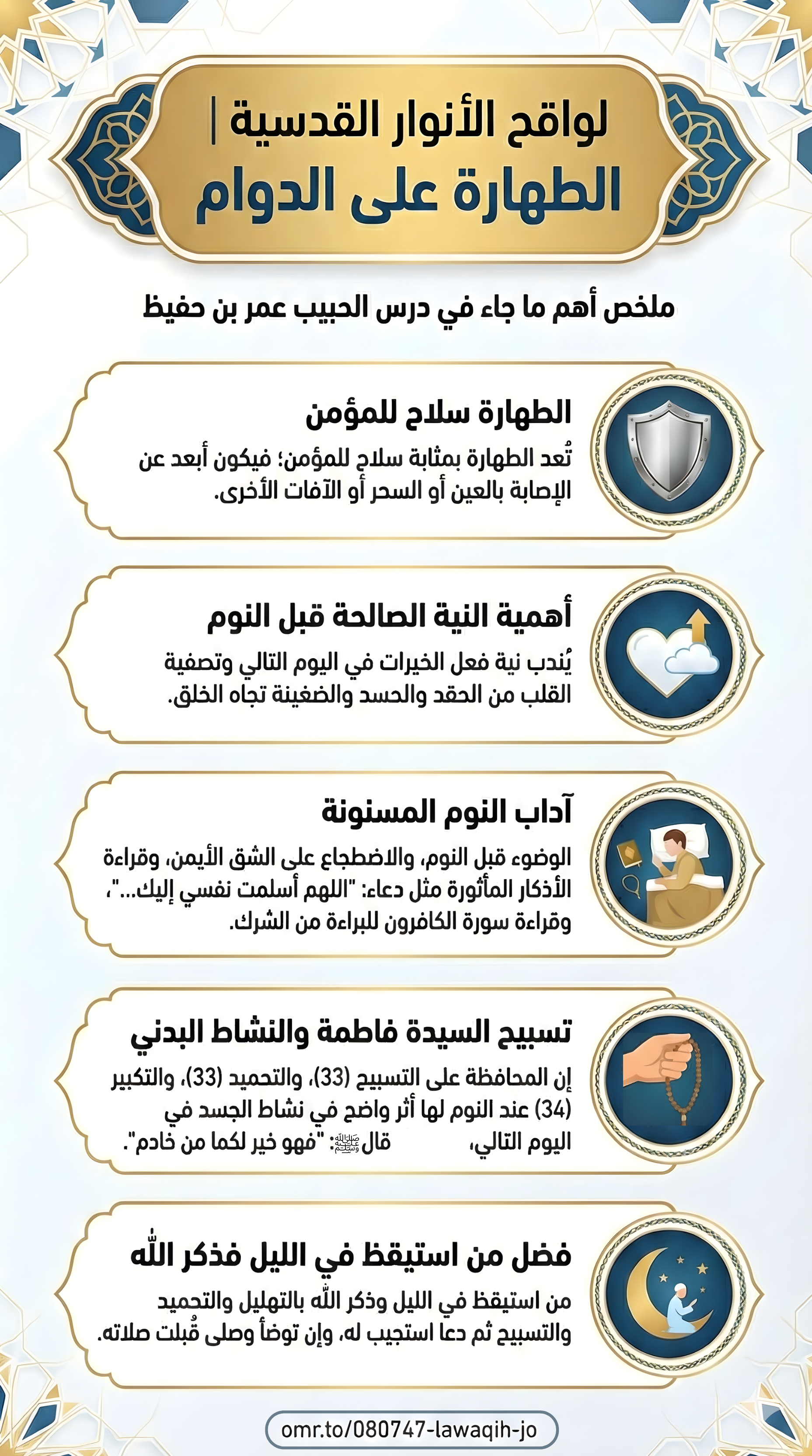 - * حقائق عن النوم واليقظة: النوم آية من آيات الله تظهر عجز الإنسان وضعفه، وهو يُذكِّر بحال الموت والبعث، والمحافظ على الآداب يكون نومه "يقظة" لاتصاله بالحق، بينما الغافل تكون يقظته "نوماً" لغفلته عن الله.