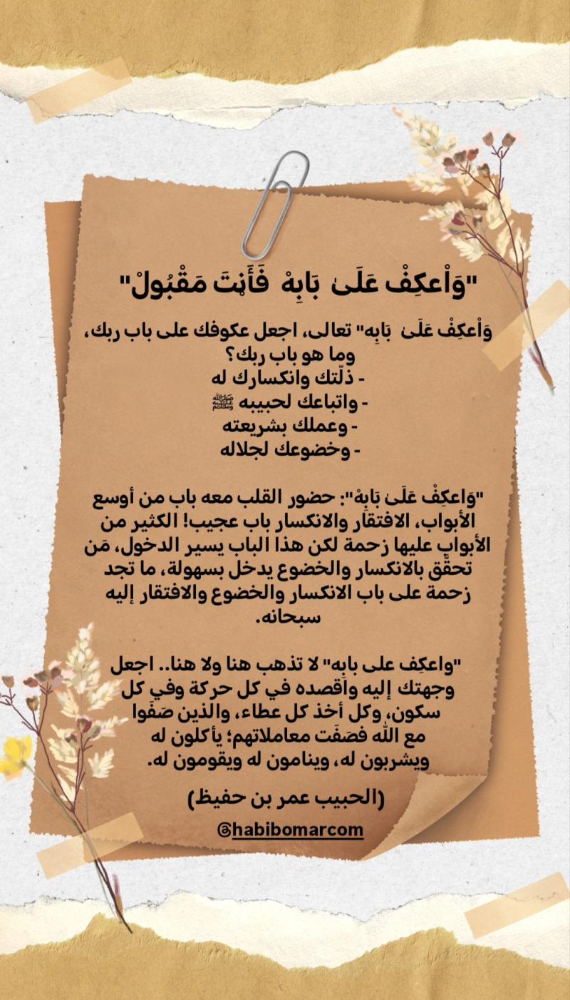"واعكِف على بابِه" لا تروح هنا ولا هنا.. اجعل وجهتك إليه وقاصده في كل حركة وفي كل سكون، وكل أخذ كل عطاء، لا إله إلا الله، والذين صَفَوا مع الله فصَفَت معاملاتهم؛ يأكلون له، ويشربون له، وينامون له، ويقومون له.