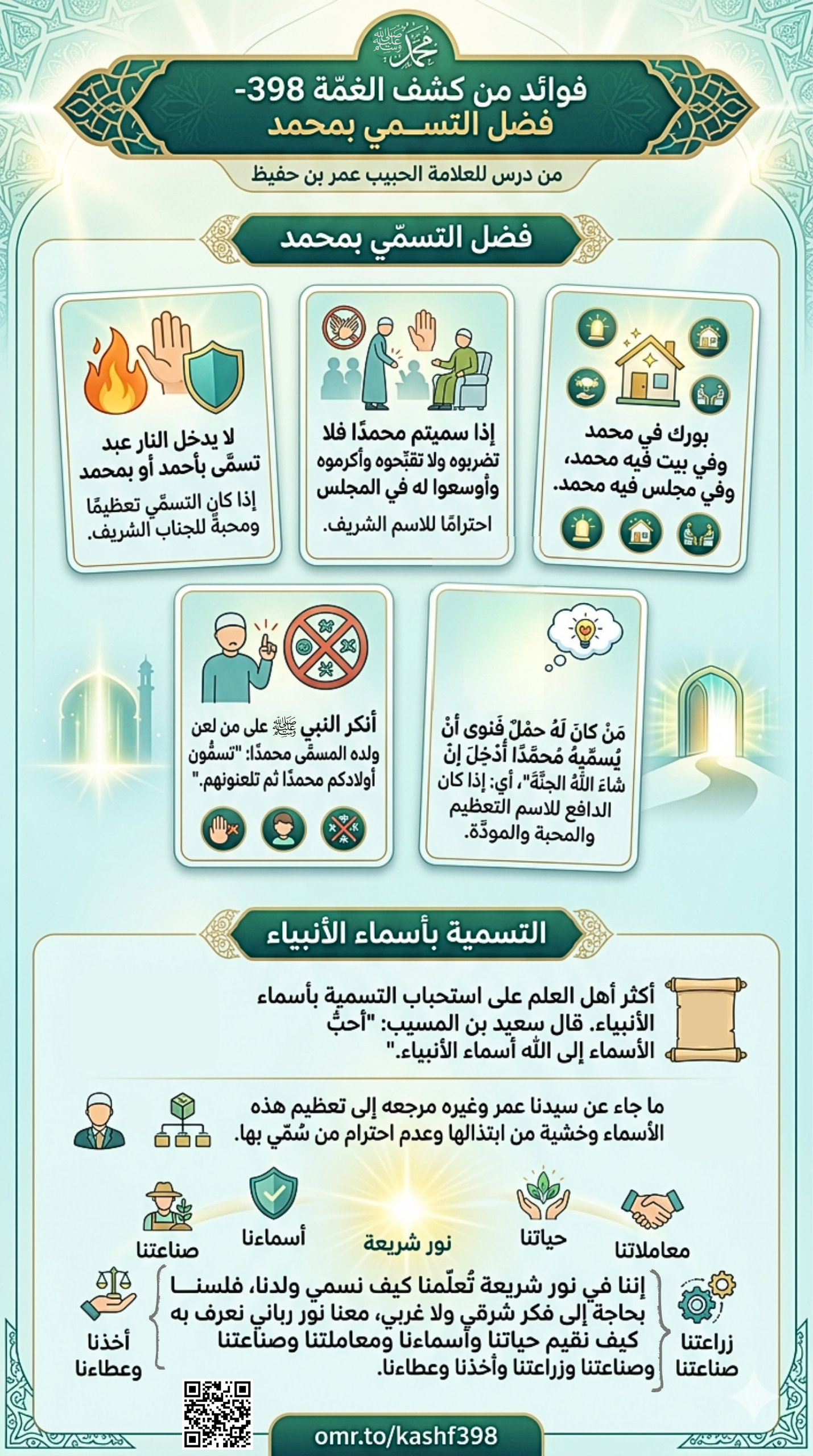 وهكذا، وعلمنا بهذا أننا في نور شريعة تُعلِّمنا حتى كيف نسمي ومن نسمي ولدنا، فلسنا بحاجة إلى فكر شرقي ولا غربي ولا عربي ولا عجمي. معنا نور رباني من الرحمن نعرف به كيف نقيم حياتنا وأسماءنا ومعاملتنا وصناعتنا وزراعتنا وأخذنا وعطاءنا.