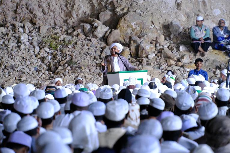 يا مُكرِم يا مُنعِم ألحِقْنا بهؤلاءِ القومِ، وكل إرادةٍ لغيرِ وجهِك في قلب أحدٍ منَّا زحزِحْها عن قلبِهِ واسلُبْها مِن قلبِهِ، حتَّى لا يريد منَّا صغيرُنا ولا كبيرُنا إلَّا وجهَكَ يا ربَّ العالمين، واقبلْنا في ذكرِنا لك، وفي تذاكرنا لشريعتِكَ، وتواصينا بأن نقومَ بالعهدِ الذي عاهدَتنا عليهِ في هذهِ التركةِ التي خلَّفَها فينا محمدٌ ﷺ، فقامَ بخدمتِها الأكابر مِنَ الرجالِ الذينَ قامَتْ على أيديهِم تأسيسُ هذهِ المجامعِ والزياراتِ، مِن عندِ سيدِنا الفقيهِ المقدَّمِ إلى مَن أدركنا مِن شيوخِنا، فارضَ عنهُم واجزِهِم خيرَ الجزاءِ، وبارِكْ لنا في أخذِ هذهِ التركة النبوية والقيامِ بحقِّها في البلدانِ والأماكنِ والوديانِ، والعرب والعجم والبدو والحضر، أداءً لحقِّ الأمانةِ في تركةِ الذي أرسلتَهُ رحمةً للعالمينَ، برحمتِكَ يا أرحمَ الراحمينَ وجودِكَ يا أجودَ الأجودينَ.